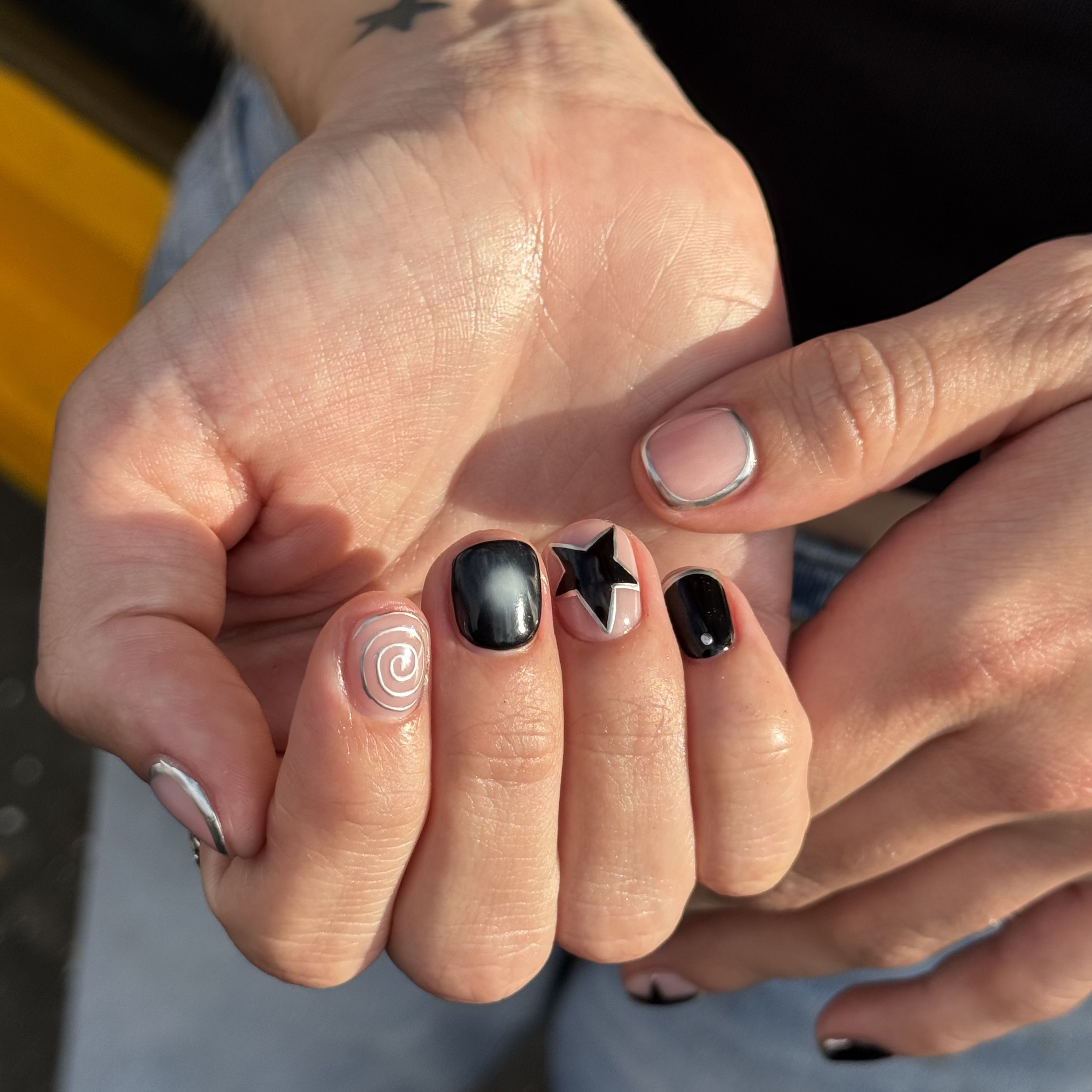 Abstract designs on a nude base, swirls, stars, animal prints, marble/quartz, aura, and simple geometric designs.+ 45 mins+ £15